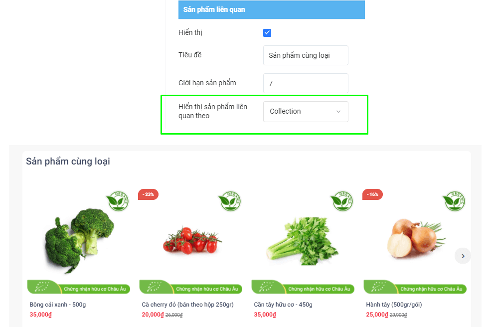 - Hiển thị sản phẩm liên quan theo collection (danh mục): Hiển thị những sản phẩm có cùng Collection với sản phẩm đang xem.