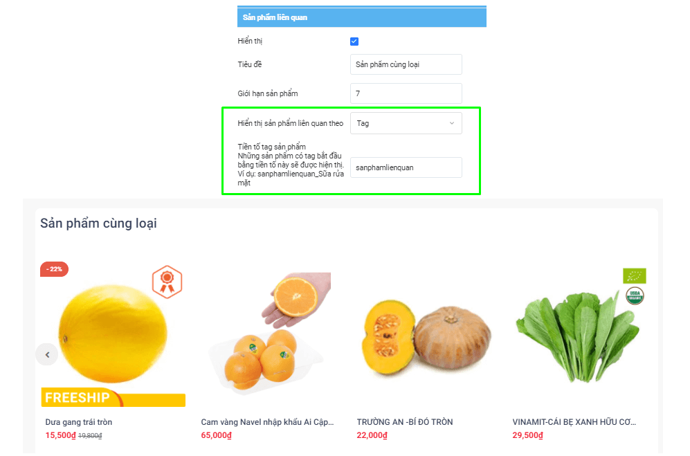 - Hiển thị sản phẩm liên quan theo tag (nhãn): Thiết lập này chọn lọc sản phẩm liên quan theo tag nên nâng cao và linh hoạt hơn. Các sản phẩm cùng tag liên quan sản phẩm hiện tại sẽ được lọc ra hiển thị tại đây nhanh chóng.