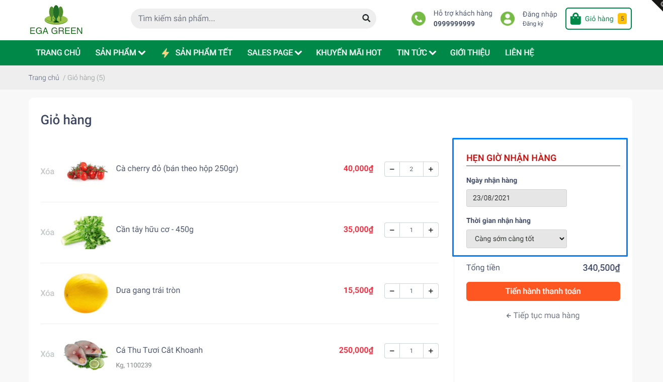 Time delivery: Tính năng hẹn thời gian giao hàng hiển thị ở trang Giỏ hàng (điều kiện hiển thị là giỏ hàng có chứa ít nhất 1 sản phẩm).