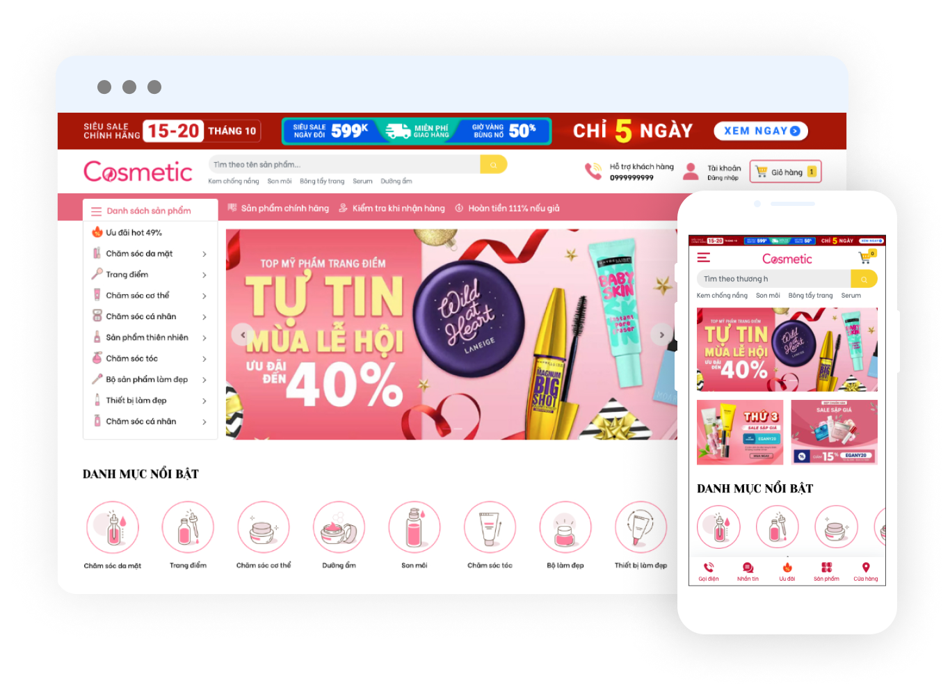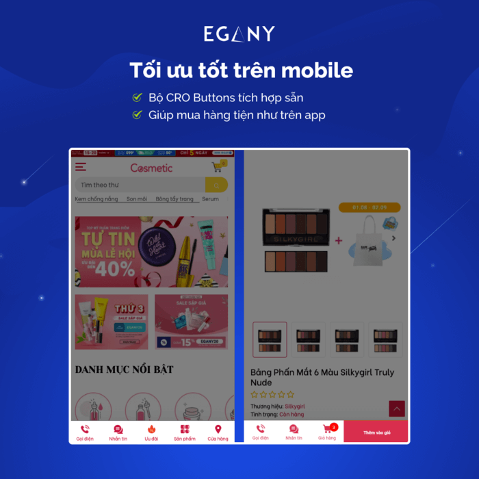 Theme EGA Cosmetic có phong cách thiết kế hiện đại, màu sắc hài hòa, giao diện được trau chuốt tỉ mỉ giúp đem tới khách hàng một trải nghiệm tuyệt vời. Đặc biệt, thiết kế UX/UI tối ưu cho Mobile và bổ sung nhiều hơn các tính năng hỗ trợ Bán Hàng Hiệu Quả khi chạy chiến dịch khuyến mãi.