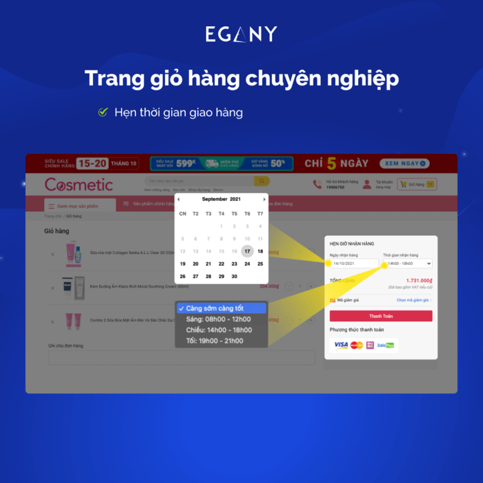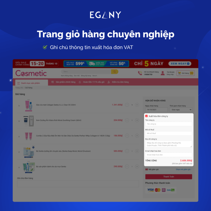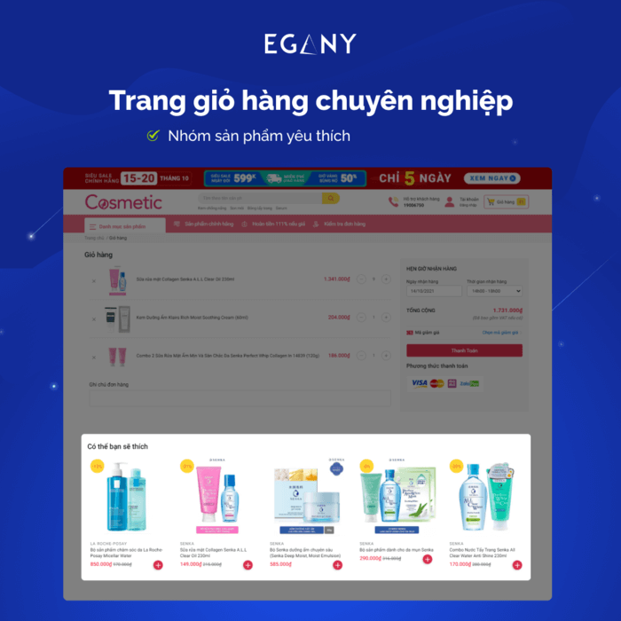 • Trang giỏ hàng chuyên nghiệp với các tính năng hỗ trợ như Hẹn thời gian giao hàng, ghi chú thêm thông tin xuất hóa đơn VAT, hiển thị thêm danh mục sản phẩm yêu thích → dễ dàng upsell