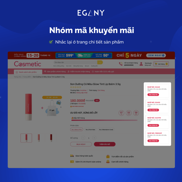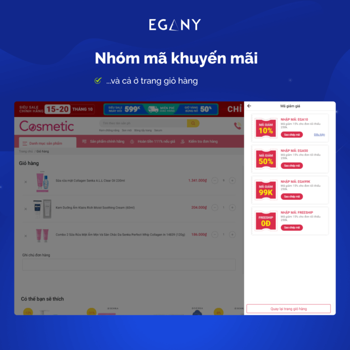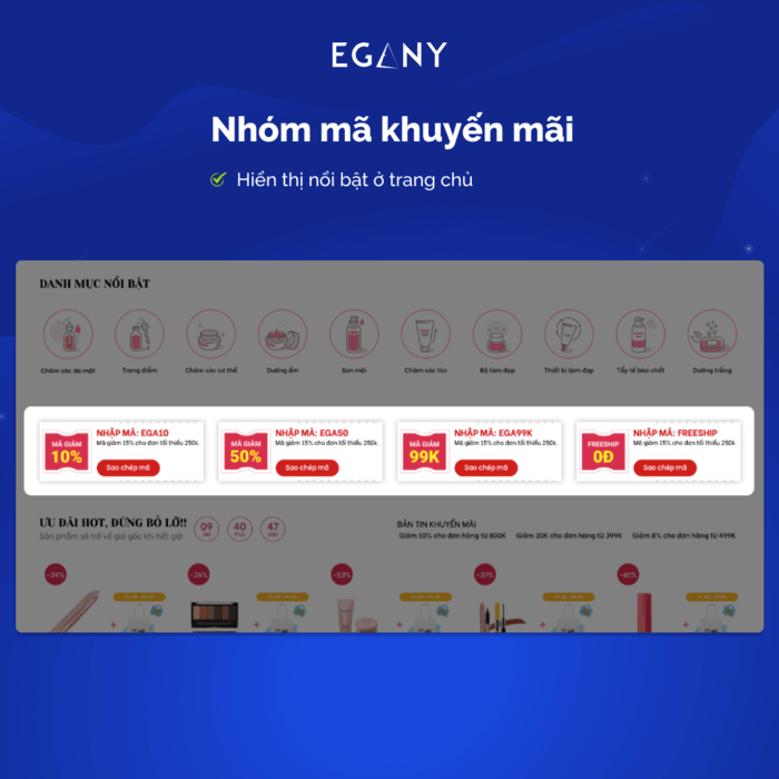 • Hiển thị nhóm mã khuyến mãi nổi bật ở trang chủ, danh sách sản phẩm, chi tiết sản phẩm và cả ở trang giỏ hàng → giúp chủ shop dễ dàng chốt đơn hàng hơn.