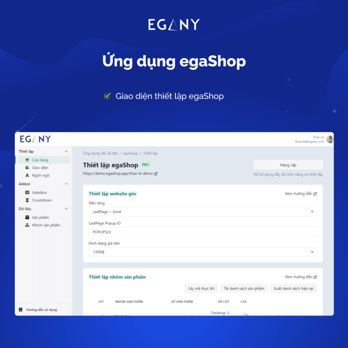 👉 Hướng dẫn thiết lập egaShop (ảnh chụp trên giao diện cũ –> team sẽ update lại sau): https://docs.egany.com/cross-platform/ega-shop